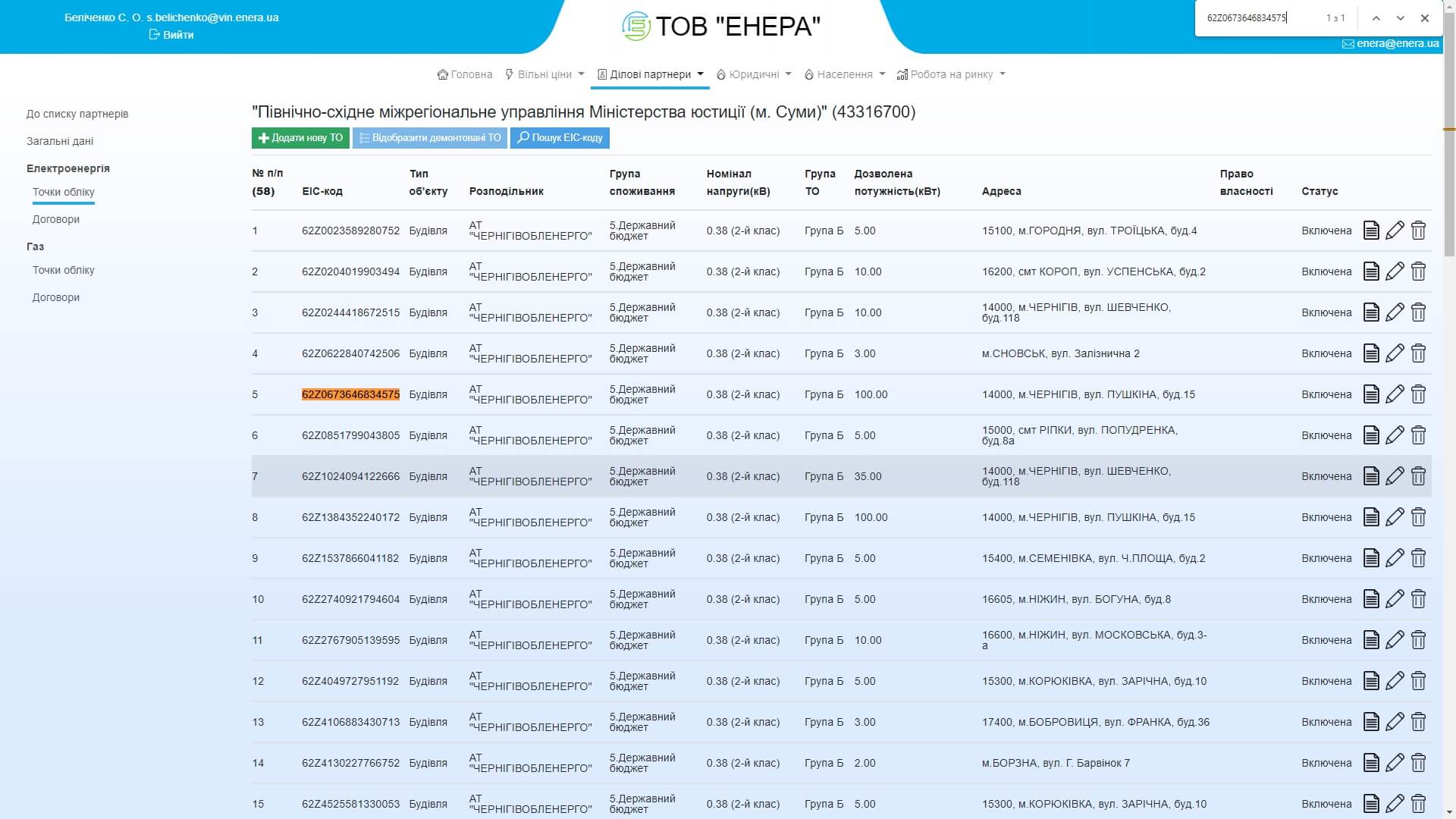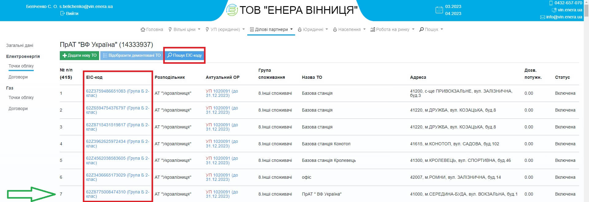 Для того, щоб виконувати вищевказані дії з будь-якою точкою обліку, потрібно спочатку зайти в список ділових партнерів, знайти необхідну точку в таблиці або за допомогою кнопки "пошук ЕІС-коду" (відмічено кольоровими прямокутниками) та після цього натиснути на ЕІС-код потрібної точки (відмічено стрілочкою на скриншоті), щоб перейти на сторінку внесення змін.