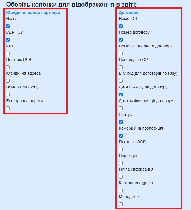 Деякі звіти (наприклад, звіт, який на скріншоті вище), можуть мати конфігуратор, який дозволяє обрати поля, які будуть відображені у звіті.