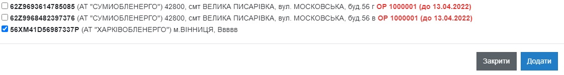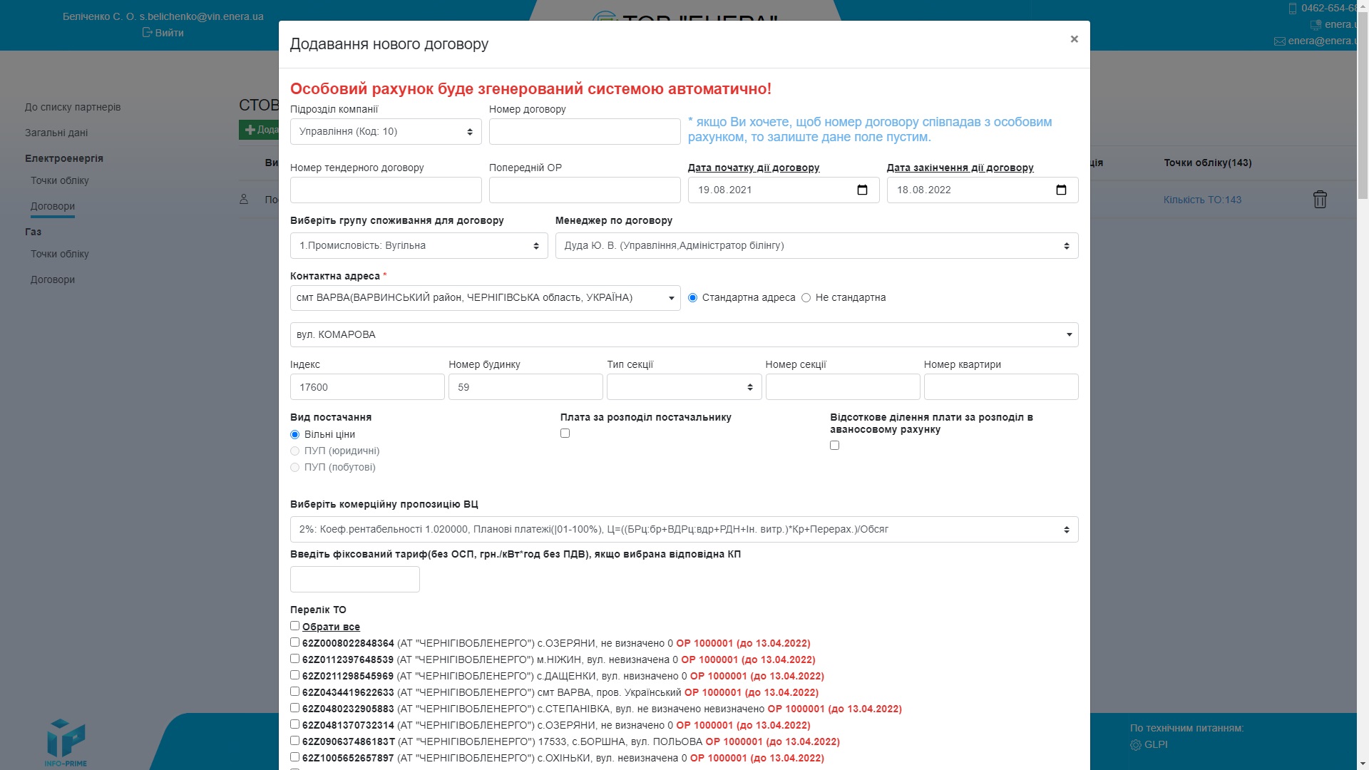 По замовчуванню всі точки, які не прикріплені до будь-якого договору, будуть обрані для додавання нового договору (приклад на скріншоті нижче), тому будьте уважні з точками обліку при додаванні договору.