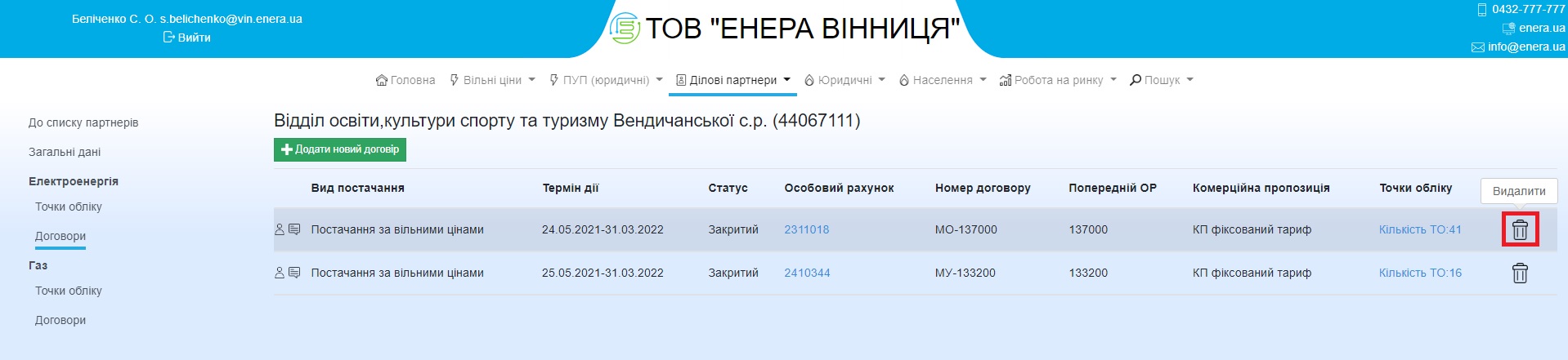 Для того, щоб видалити договір, потрібно знайти потрібного ділового партнера, відкрити картку партнера, натиснути відповідну кнопку да підтвердити дію.