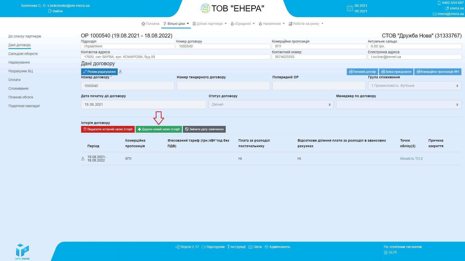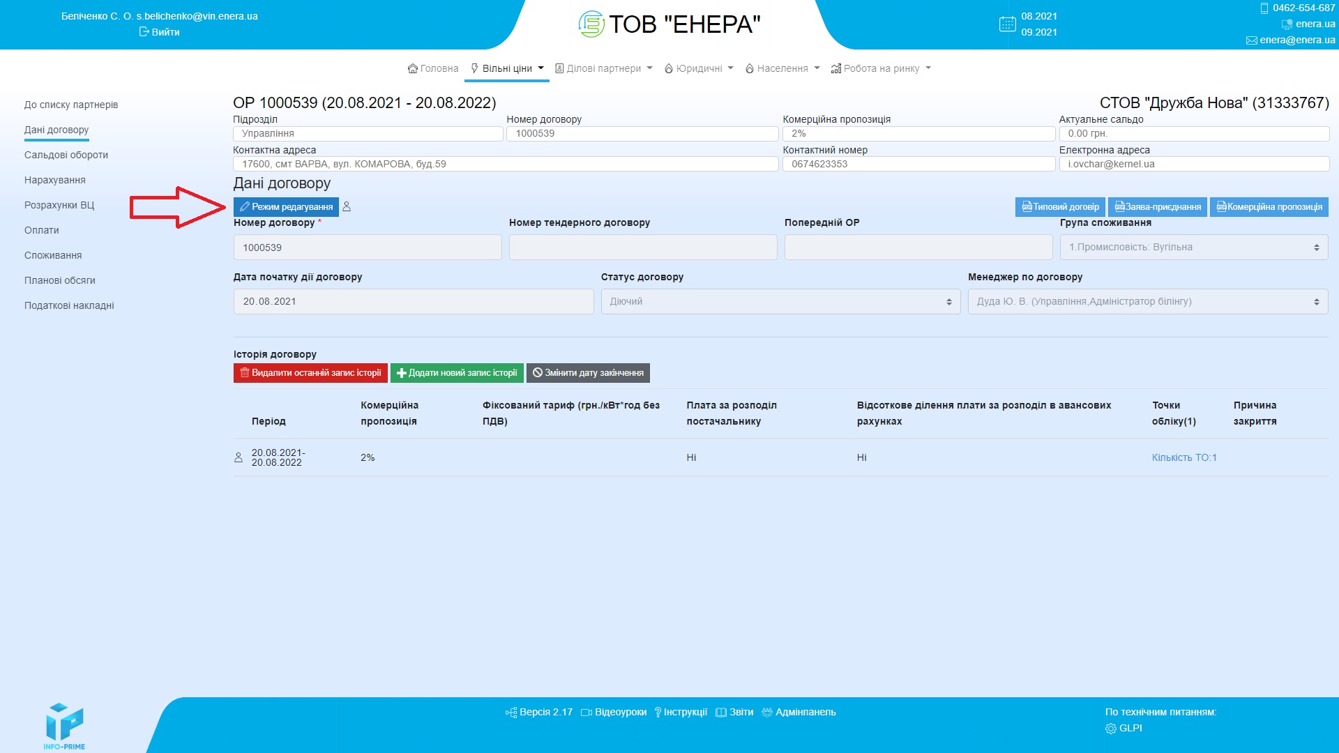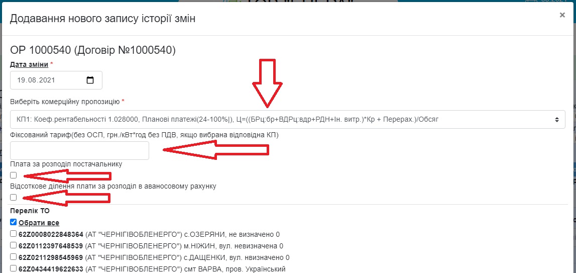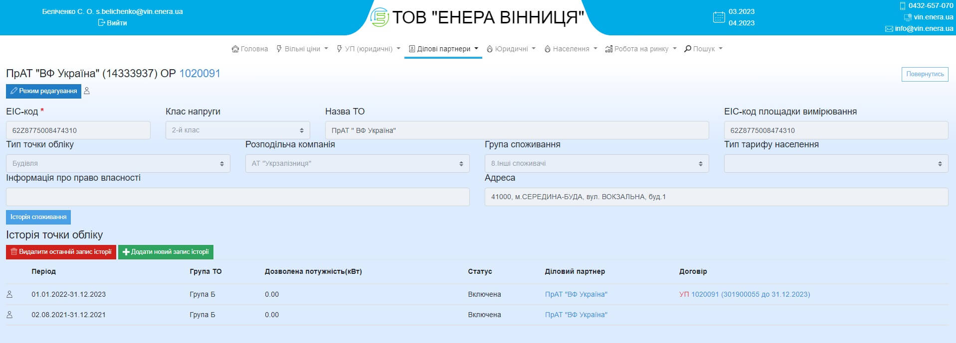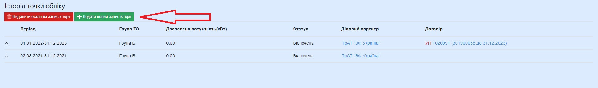 На цій сторінці внесення змін ТО Ви можете виконати всі вищеописані дії, а також побачити історичні записи точки та перейти до договору, до якого прикріплена точка на період історичного запису. Сторінка має наступний вигляд: