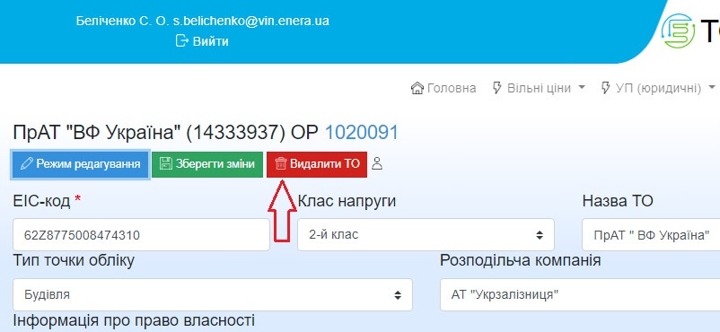 Для того, щоб видалити ТО, потрібно на сторінці внесення змін ТО натиснути кнопку "режим редагування",