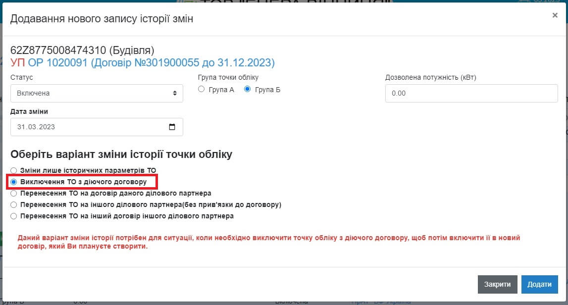 Для того, щоб виконати дію "Виключення ТО з діючого договору", потрібно у вікні "Додавання нового запису історії змін" обрати потрібний варіант,