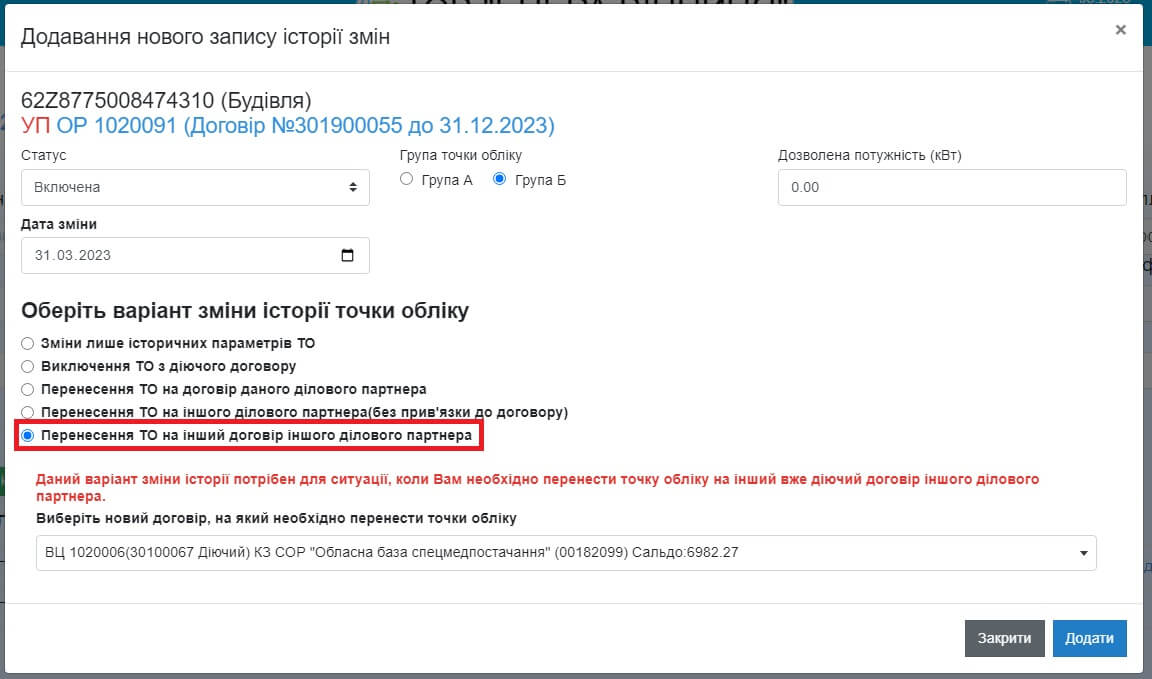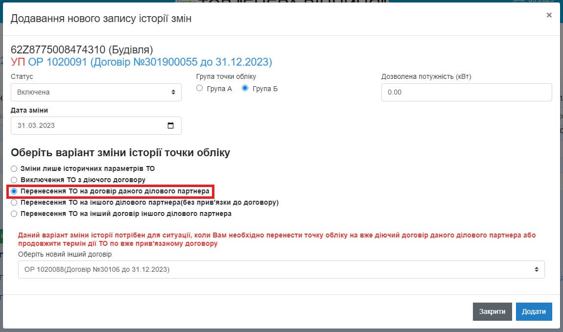 Для того, щоб виконати дію "Перенесення ТО на інший договір іншого ділового партнера", потрібно у вікні "Додавання нового запису історії змін" обрати потрібний варіант,