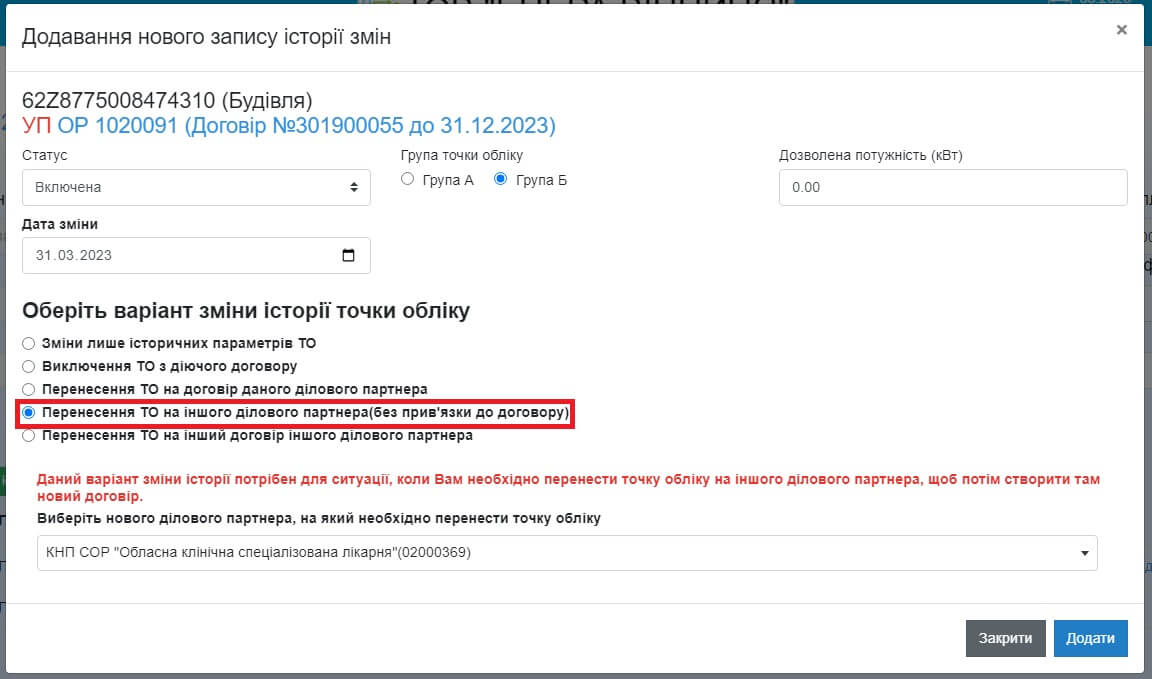 Для того, щоб виконати дію "Перенесення ТО на іншого ділового партнера(без прив'язки до договору)", потрібно у вікні "Додавання нового запису історії змін" обрати потрібний варіант,