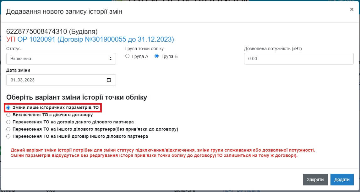 Для того, щоб виконати дію "Зміна лише історичних параметрів ТО", потрібно у вікні "Додавання нового запису історії змін" обрати потрібний варіант,