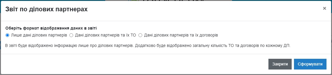 Всього є три види звітів: "Лише дані ділових партнерів", "Дані ділових партнерів та їх ТО" і "Дані ділових партнерів та їх договорів". Кожен звіт містить підказку про поля, які будуть відображені в цьому звіті.