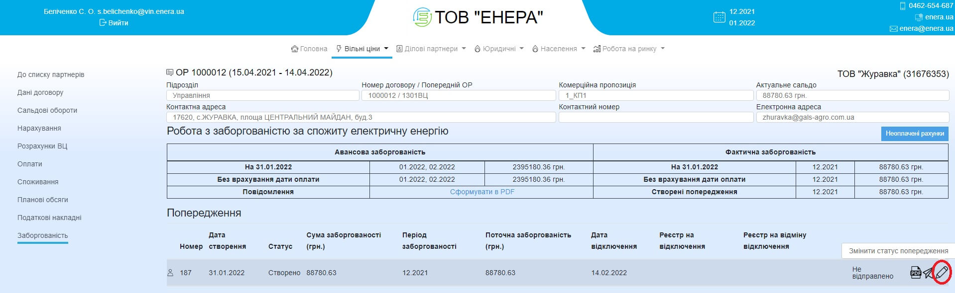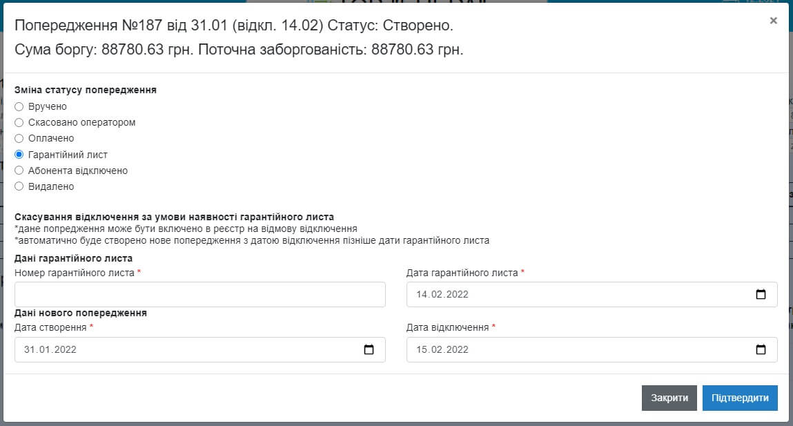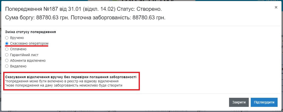 Система перевіряє повне погашення заборгованості рахунків, по яких створено попередження та автоматично зміненює статус попереджень на "Оплачено".