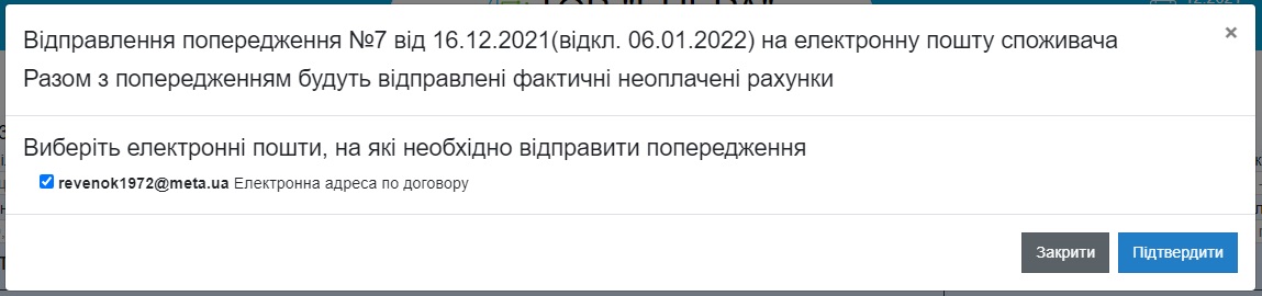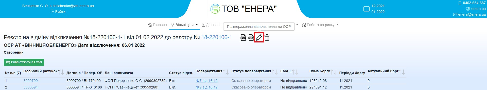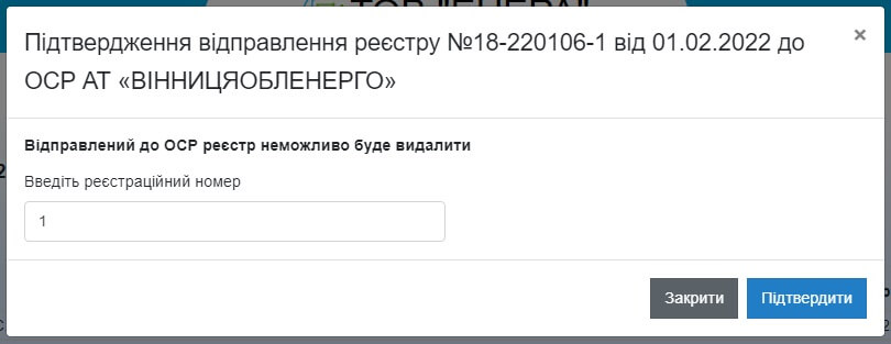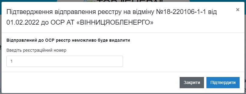 потім потрібно натиснути кнопку "підтвердити", після чого буде створено реєстр на відміну відключення.