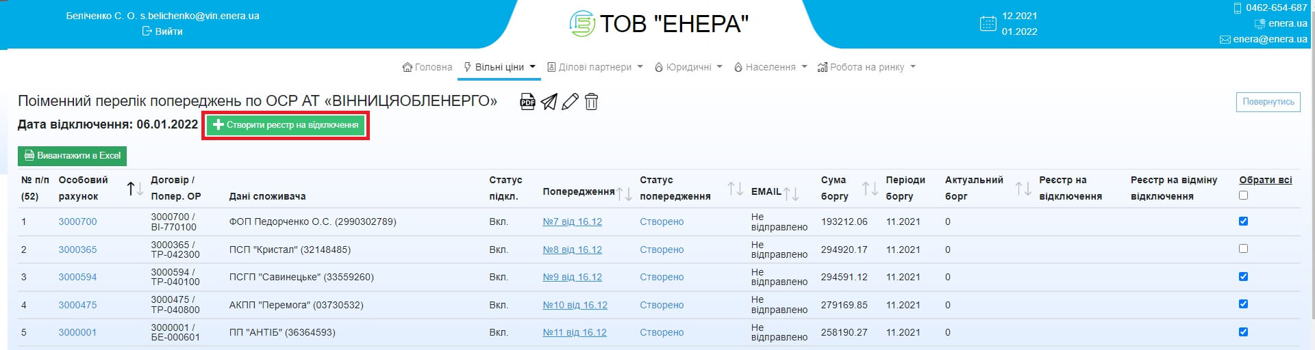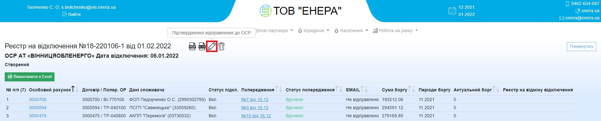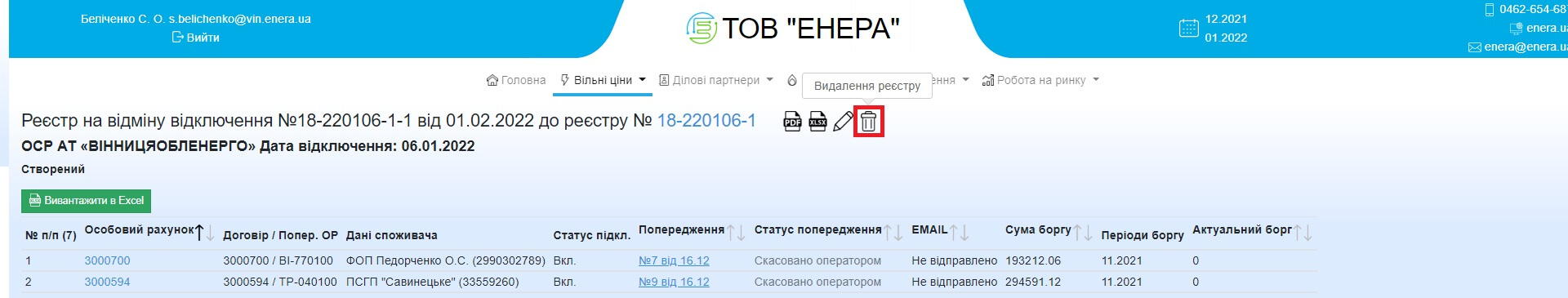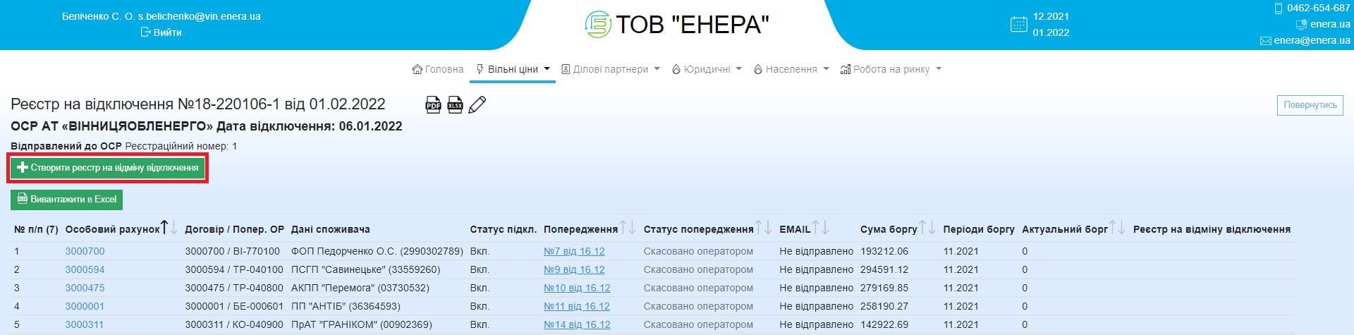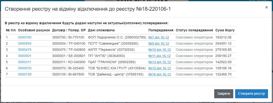 Для того, щоб створити реєстр на відміну відключення, потрібно зайти в потрібний реєстр відключення (через головне меню перейти в пункт "Реєстри на відключення" розділу "Робота з боржниками", знайти потрібний реєстр та перейти на сторінку реєстра) та натиснути кнопку "Створити реєстр на відміну відключення"