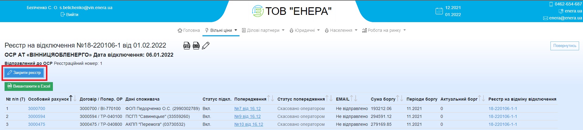 Кнопка "Закрити реєстр" з'явиться тільки у тому випадку, коли всі попередження в таблиці мають статус "Відключений" та/або включені в список реєстру на відміну відключення.