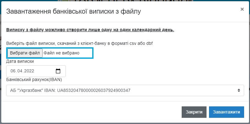 3) У вікні, що відкрилось, натиснути на кнопку "Вибрати файл", обрати необхідний файл для завантаження, потім обрати необхідну дату виписки та банківський рахунок, після чого натиснути "Завантажити"