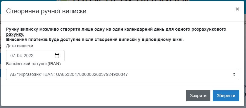 На одну дату та на один розрахунковий рахунок може бути створена тільки одна ручна виписка та тільки одна виписка з файлу. Наприклад: на дату 15.03.2022 на один умовний IBAN може бути створена одна ручна виписка та завантажена одна виписка з файлу.