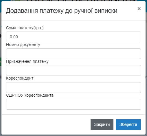 Для того, щоб створити ручний платіж, потрібно натиснути на кнопку "Додати платіж", у відкритому вікні заповнити всі поля необхідними даними та натиснути "Зберегти".