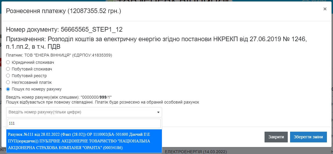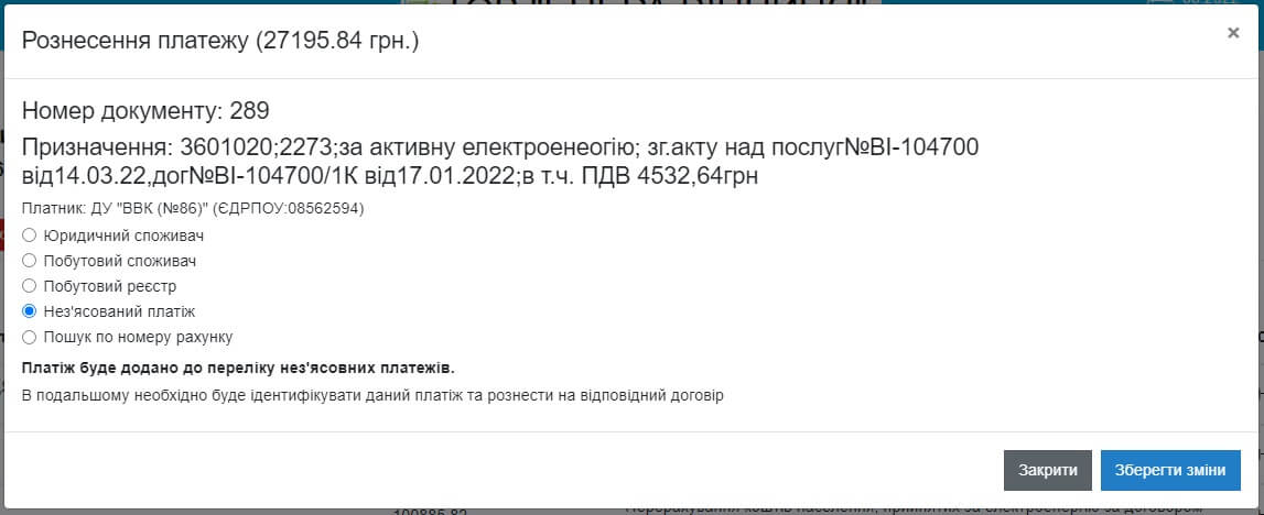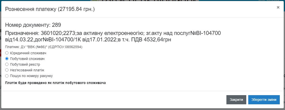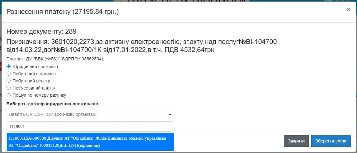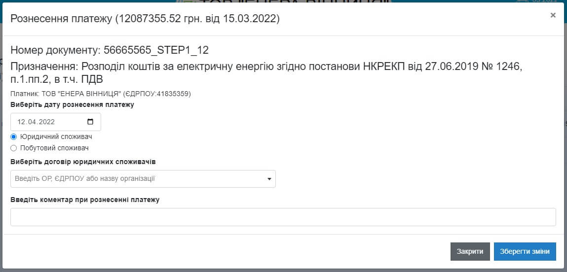 і у відкритому меню заповнити необхідну інформацію, а саме: обрати правильну дату, на кого розносити (на юридичного споживача, скориставшись пошуком, або на побутового споживача, аналогічно як в інструкції №2 при рознесенні платежу), написати коментар і після цього натиснути кнопку "Зберегти зміни".