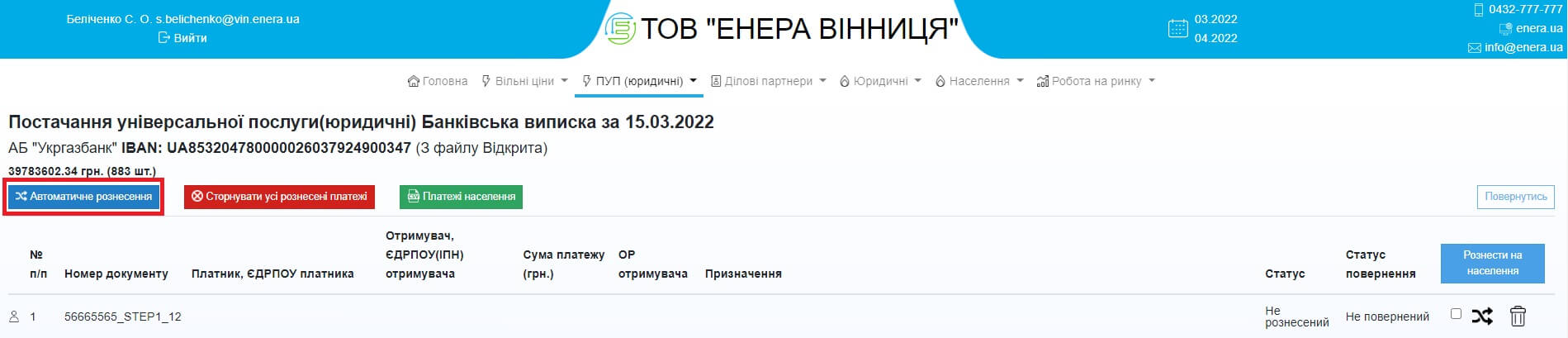 3) Натиснути кнопку "Автоматичне рознесення". Натискання кнопки не потребує додаткових підтверджень, рознесення починається відразу після натискання кнопки.