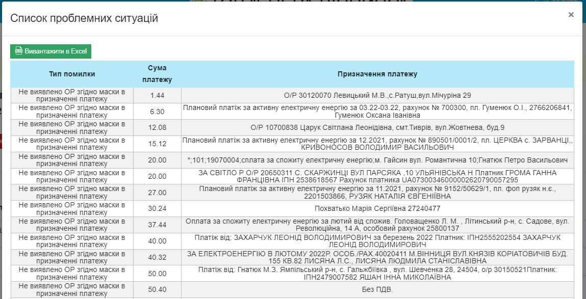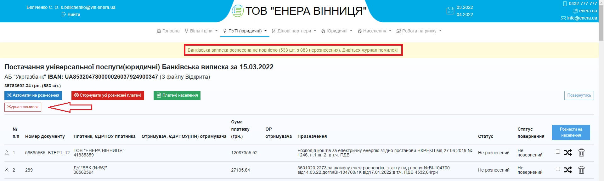 Після завершення сторінка перезавантажиться з результатами рознесення та з'явиться кнопка "журнал помилок", де можна детальніше подивитись, які саме оплати не рознеслись і по якій причині не вдалось їх розпізнати і при бажанні зберегти журнал помилок в форматі Excel. Приклад результатів автоматичного рознесення та скріншот журнала помилок Ви можете побачити на скріншоті нижче:
