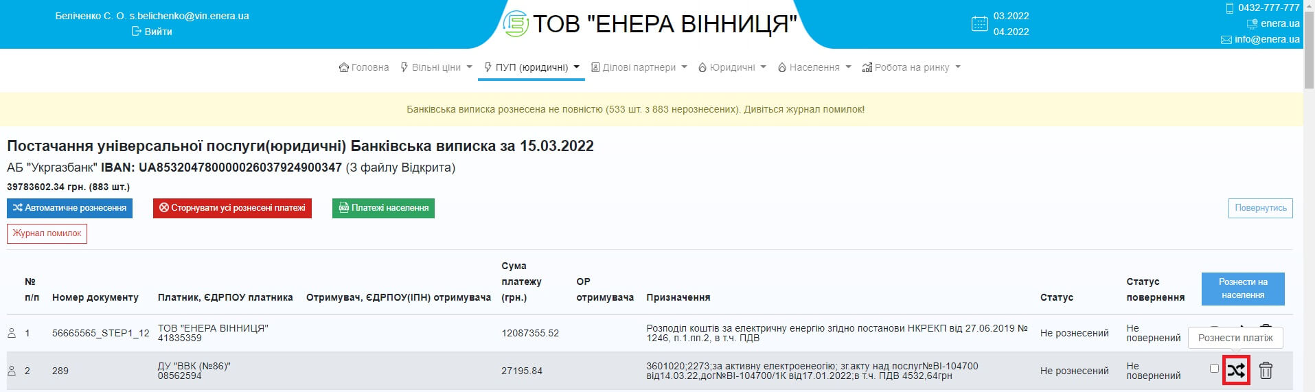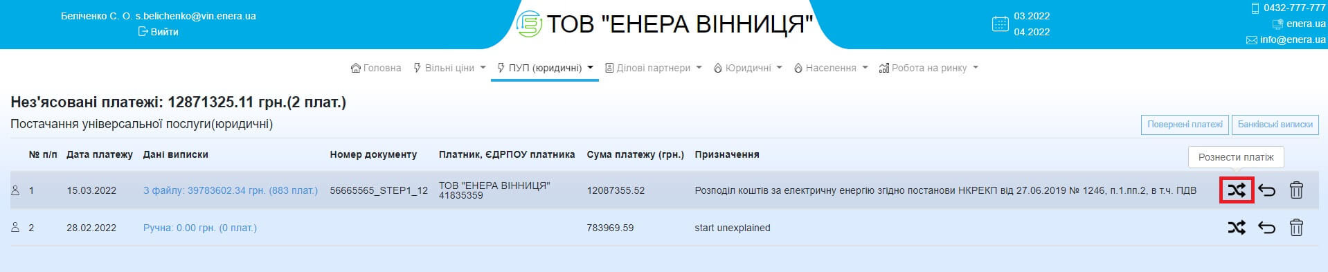 Для того, щоб рознести платіж, потрібно натиснути на відповідну кнопку