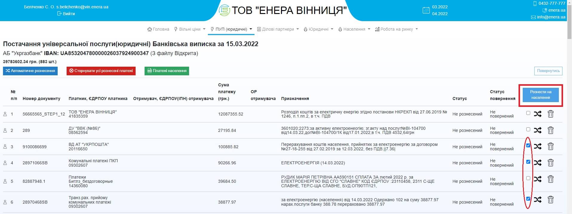 Також є можливість обрати декілька платежів за допомогою галочок та рознести ці платежі як одиничні оплати населення.