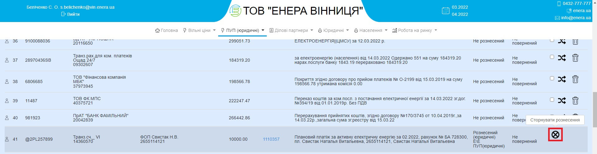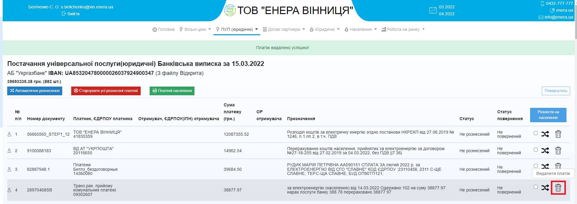 Для того, щоб видалити нерознесений платіж, потрібно знайти потрібний платіж в таблиці та натиснути на кнопку "Видалити платіж":