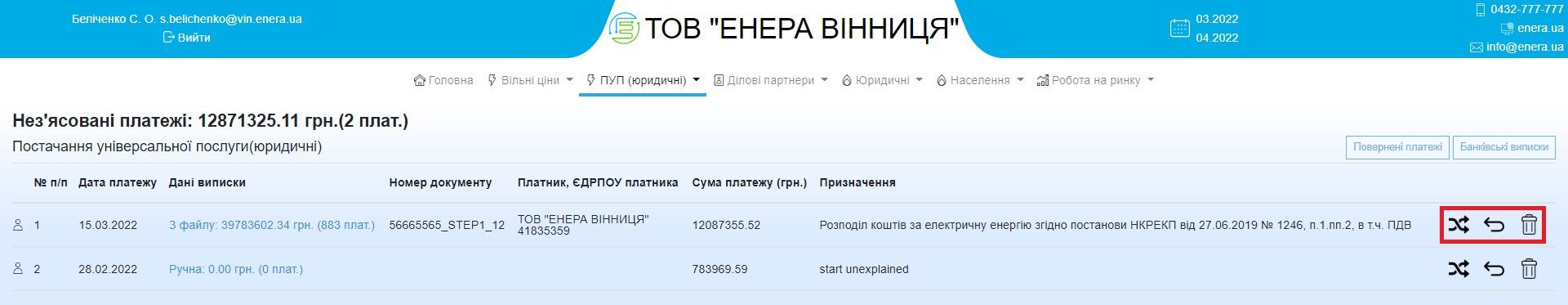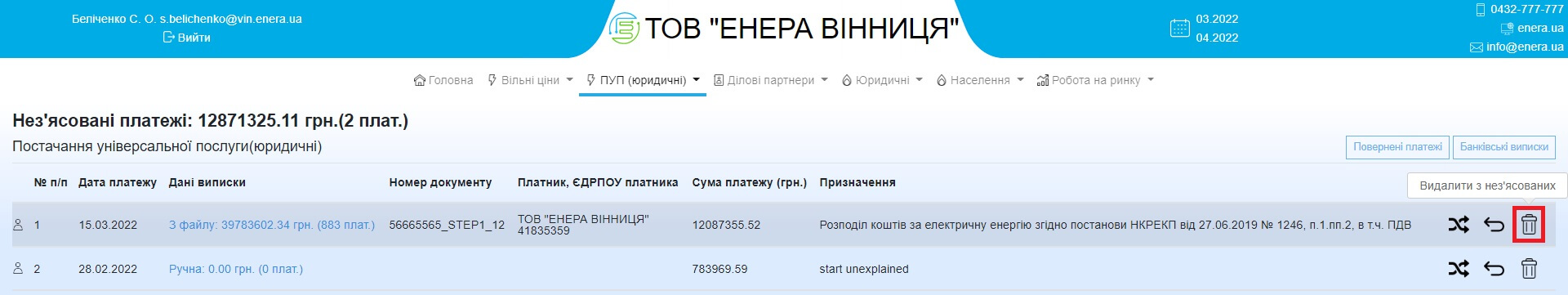 Для того, щоб видалити платіж з нез'ясованих, потрібно натиснути на відповідну кнопку