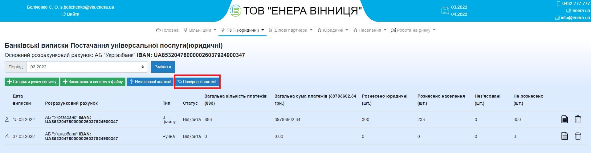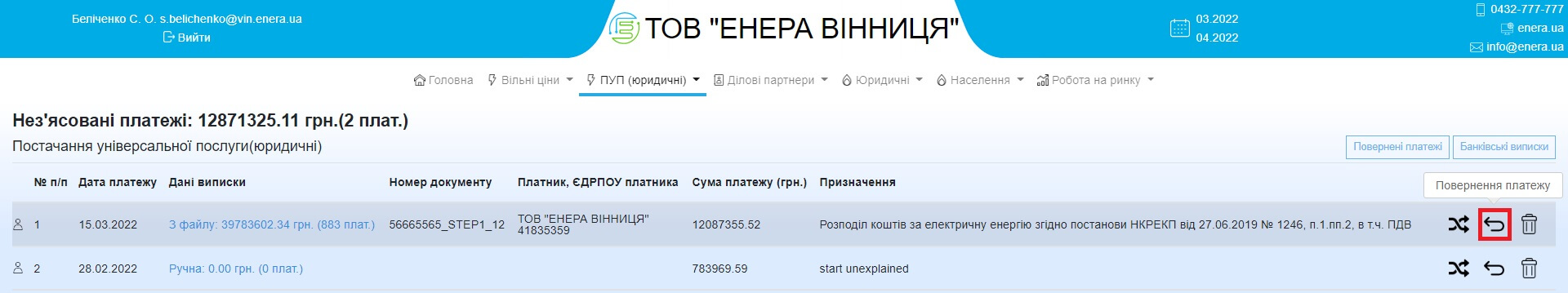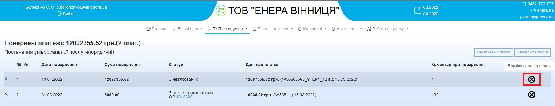 На цій сторінці Ви можете побачити всі повернені платежі, які потрапили сюди після повернення платежу з банківської виписки, повернення з сторінки "Нез'ясовані платежі" або повернення з пункту "Оплати" в картці договору та відмінити повернення платежів.