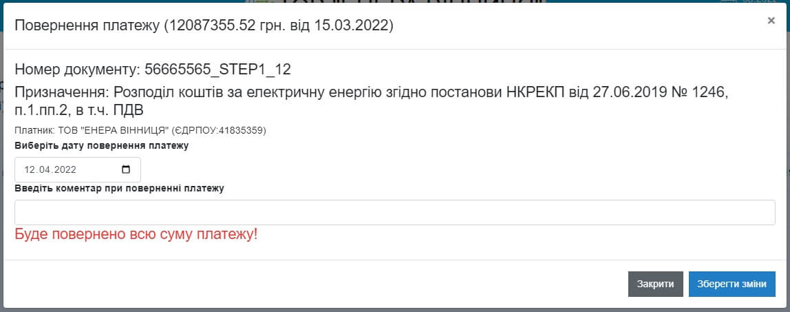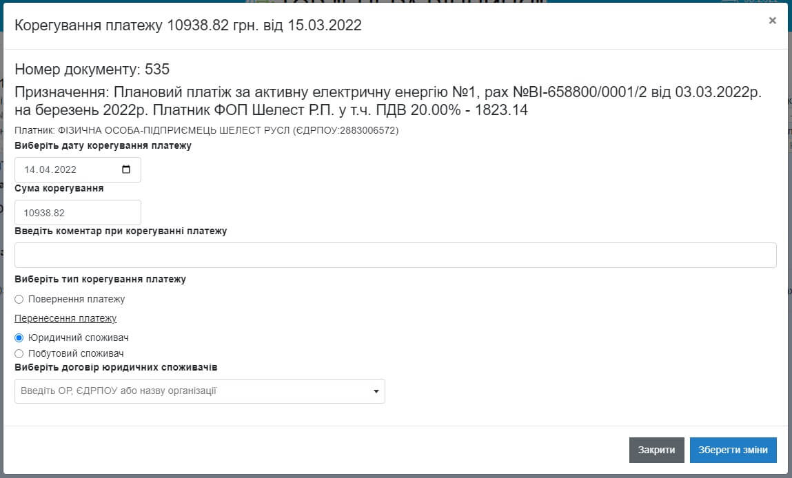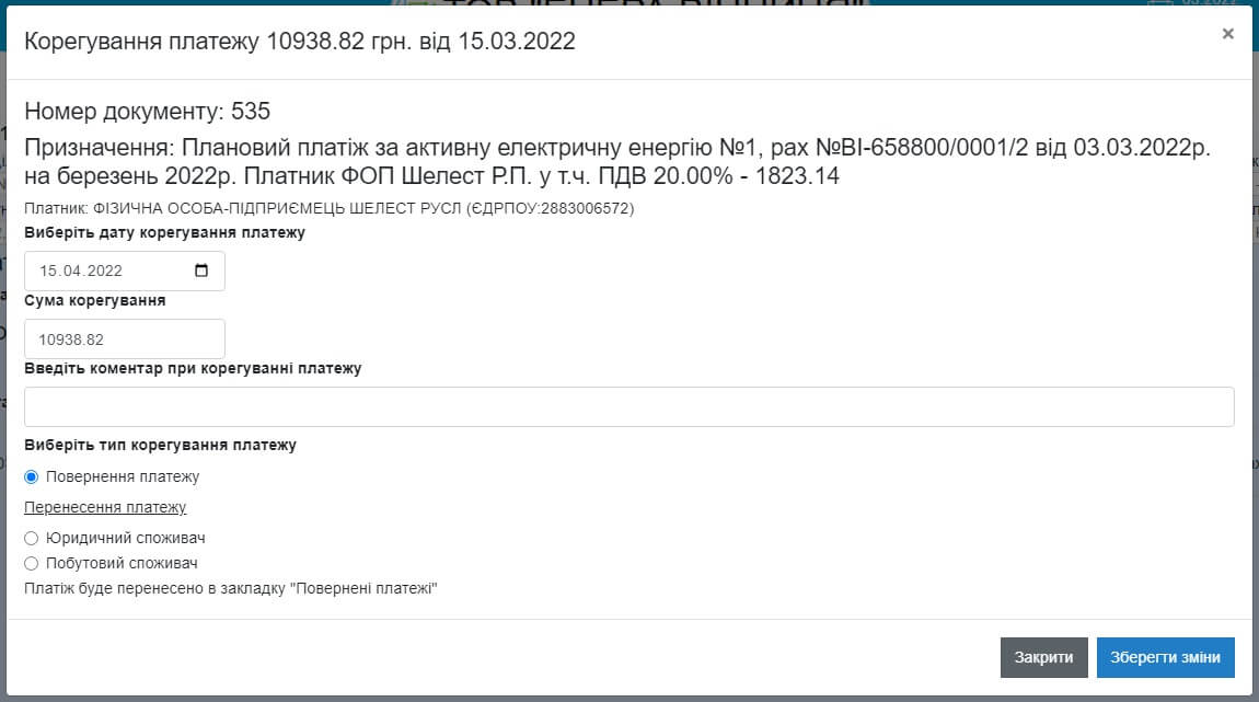і у відкритому меню вказати, дату, суму платежу, написати коментар, обрати тип коригування: повернення платежу або перенесення на юридичного/побутового споживача та натиснути кнопку "Зберегти зміни". Розглянемо кожен варіант дії окремо.