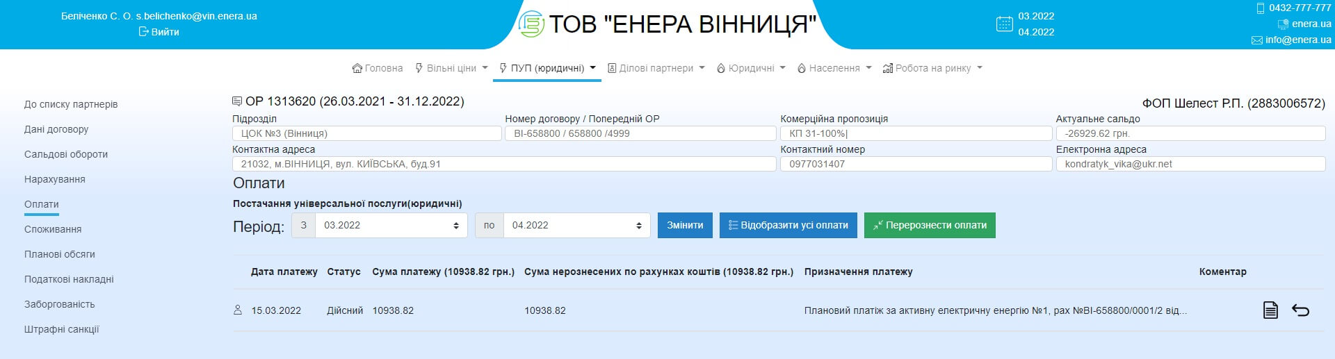 1) Перейти на сторінку "оплати" договору, куди було здійснено перенесення платежу