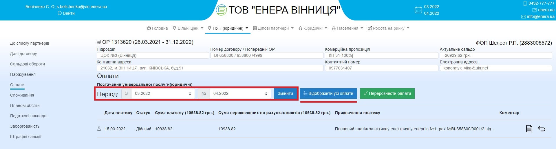 На цій сторінці Ви можете побачити оплати за відкриті періоди. Є можливість відобразити всі платежі (натиснувши відповідну кнопку, на скріншоті підкреслена червоним), обрати періоди відображення оплат (виділено червоним прямокутником) та перерознести всі оплати, натиснувши відповідну кнопку (наприклад, після коригування певної оплати).