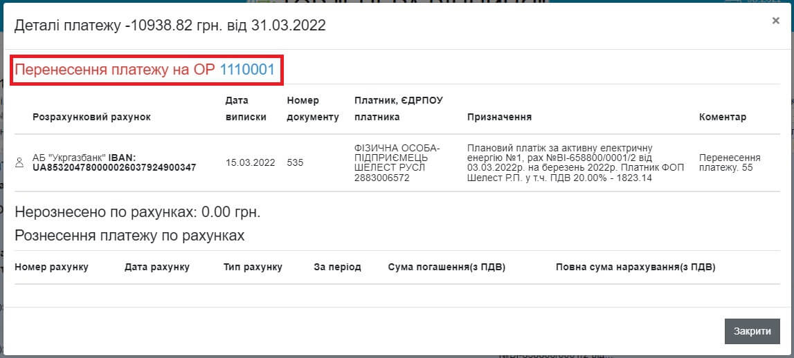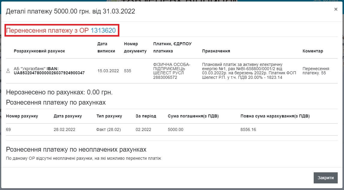 Подібна інформація відображається в платежі договору, куди був перенесений платіж, якщо натиснути на кнопку "Деталі платежу":