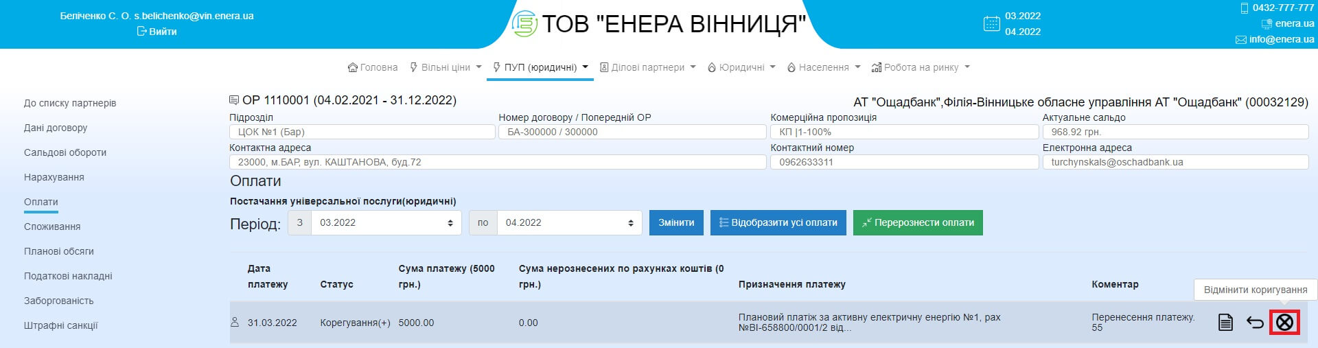 Для того, щоб провести коригування платежу, потрібно натиснути на відповідну кнопку